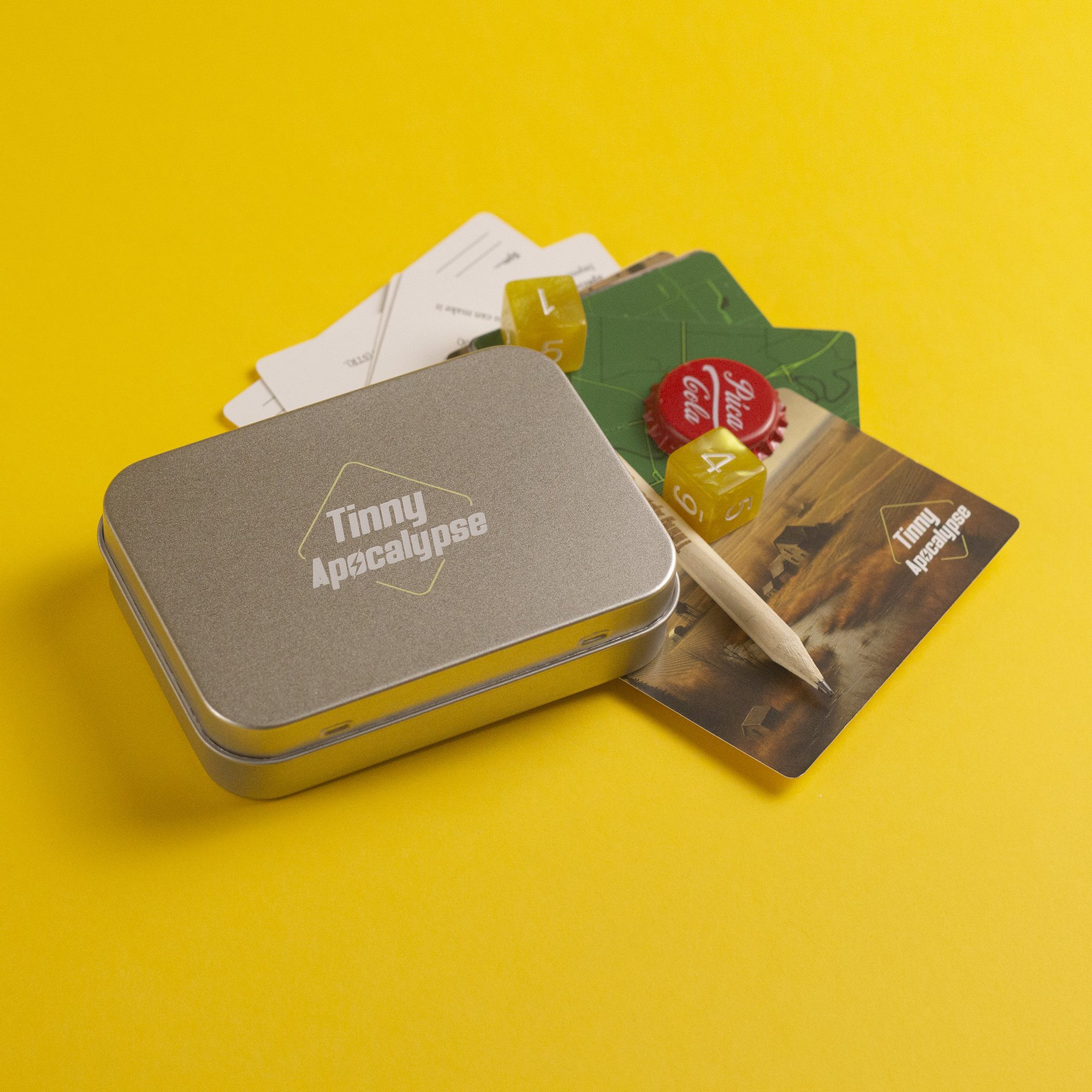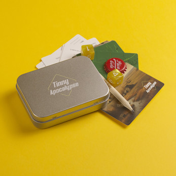 Survive the wasteland with Tinny Apocalypse, a micro-RPG packed into a tiny tin box! This rules-light, exploration-heavy game lets you scavenge, fight, and roleplay your way through a radiation-soaked world—all with double-sided cards, two d6 dice, and a bit of luck.